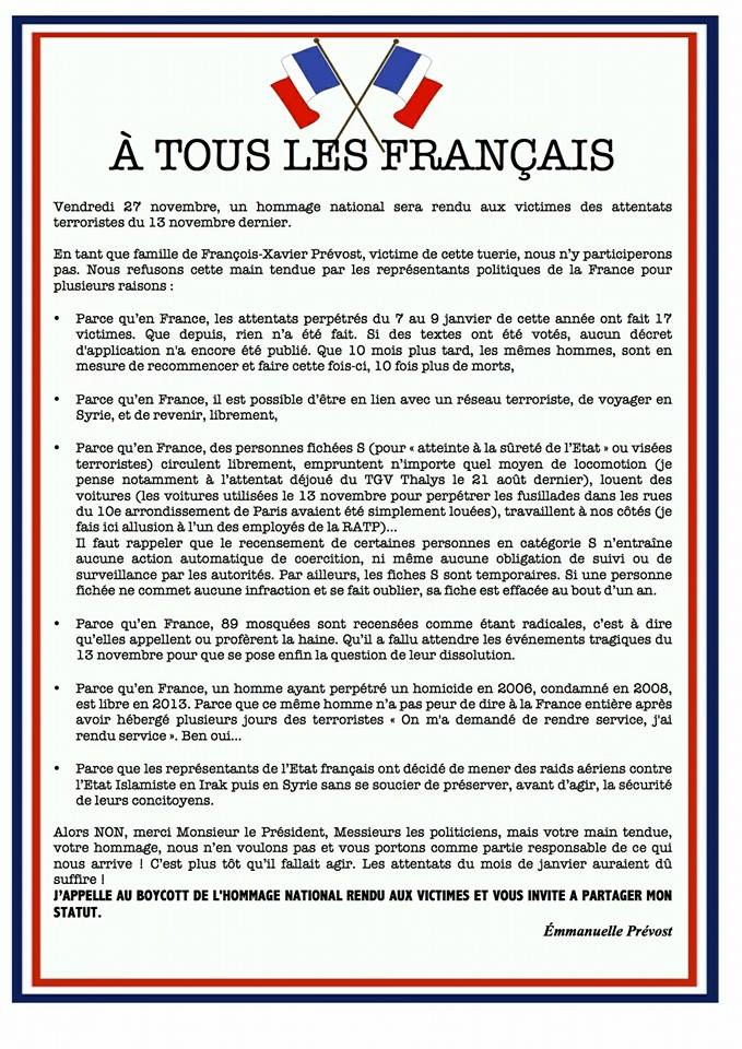 Alors, je ne sais si j’ai l’esprit tordu, certains sont en droit de le penser, en tout cas d’autres esprits me rejoignent affirmant qu’il s’agit d’une récupération politicienne, une pêche aux électeurs qui a quelque chose d’insultant pour les morts que déjà des voix s’élèvent parmi les familles de victimes pour dénoncer cette récupération patriotique si décriée il y a peu. À ce sujet voici la déclaration de l’une d’elles qui montre bien son dégoût pour la chose :